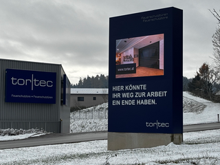 In Wolfsegg wurde für die Tortec Brandschutztor GmbH ein LED-Display der USK-Serie in einen Pylon integriert. Das Display verfügt über eine Fläche von 1,5 m x 1,0 m und einen Pixelpitch von 2,6 mm.